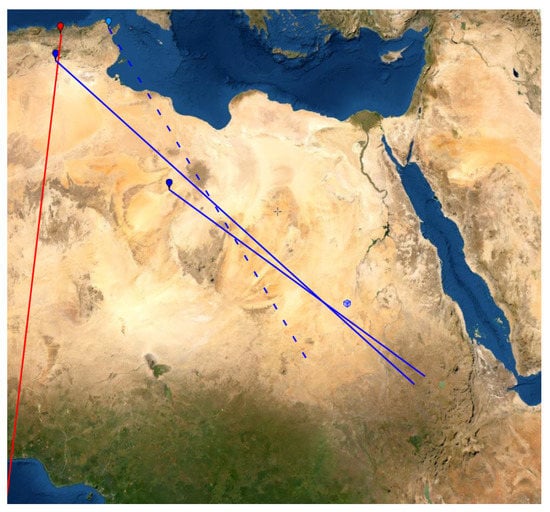One may conjecture that the early Muslims were, for some unknown reason, not able to determine the bearing to the reconstruction point with the same precision as the mosques facing Petra. The result can be seen in Table 5. With this compression, the distortion of the reconstruction point is 0.01329 corresponding to a circular standard deviation of The mosques associated with the reconstruction point are approximately the same as the ones that D. Gibson classified as having “the between qibla” []. According to Dan Gibson’s theories “the between qibla” was used because of political tensions between the ruling Umayyad dynasty and the Abbas family that would later establish the Abbasid dynasty. According to his theories, the mosques that used “the between qibla” used the bisector or median between the bearing to Petra and the bearing to Mecca.