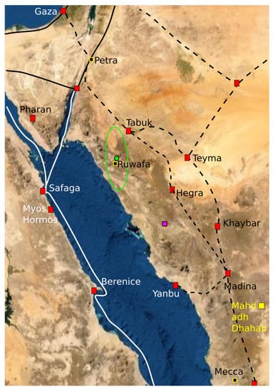 In order to calculate a confidence region for the reconstruction point , we fix the reconstruction points for the cluster to Petra and fix the reconstruction point of the cluster to the Dome of the Rock in Jerusalem. With these reconstruction points fixed, we calculate the optimal reconstruction point of cluster and calculate a confidence region around this point. The confidence region for cluster is illustrated in Figure 14. The confidence region does not contain any ancient settlements, and it does not intersect any of the ancient trade routes. The confidence region does not contain the midpoint between Petra and Mecca as suggested by D. Gibson. The optimal reconstruction point is located at E 36.2188 N. The only site of archaeological relevance within the confidence region is the Ruwāfa Temple that lies completely isolated in the desert [] (pp. 44–49) and it is located just a few kilometers from the optimal reconstruction point. The temple has not been excavated, but some interesting inscriptions reveal that it was built around 160 CE for Ilāh (older version of Allāh). The observation that the Ruwāfa Temple is almost at the optimal reconstruction point is new knowledge, and it is still far from clear how this result should be interpreted.