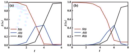 Figure 2 shows the time evolution diagram of the individuals in the S-state, A-state, and R-state. The parameters of (a) and (b) are adopted as and , respectively. In general, the network starts off with only S-state individuals and steadily decreases to 0 over time. The proportion of individuals in the A-state gradually increase to the highest peak, and decrease to 0. Over time, the R-state steadily moves up to the final adoption scale. As the adoption threshold parameter increases from in subgraph (Figure 2a) to in subgraph (Figure 2b), the cost of the evolution time continuously rises from 6 to 8. The phenomena illustrate that information spreading on a multi-layer network can be promoted by individual behavior reinforcement (active adoption behavior).