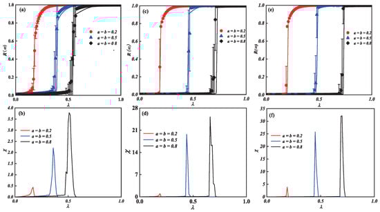 The relative variances and crucial information spreading possibilities of (a,c,e), are shown in Figure 3b,d,f. The deviation of information spreading, which is depicted by the top values of relative variance , is where the global adoption information will arise. Additionally, the process of information spreading will start earlier as individual diverse behavior enhances. When the network_size increases gradually, the process of information propagation is delayed and the deviation of information propagation is increased, as shown in Figure 3b,d,f. Finally, our theoretical analyses (lines) match the outcomes of the simulation (symbols).