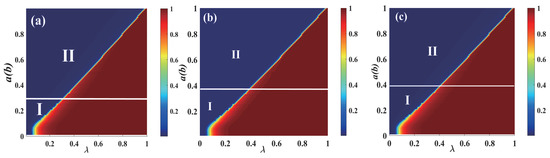The combined impact of the parameters plane (, a) ((, b)) on on the multi-layer ER network is examined in Figure 4. A crossover phenomenon appears as the value of increases. The diagram can then be split into two sections. The continuous phase transition with a second order is visible from region I as the increase in is in the growing pattern of the individual final spreading scale . As increases in region II, the growing pattern displays a first-order discontinuous phase transition. The information spreading and the transition from a second-order continuous phase transition to a first-order discontinuous phase transition are both changed by the intensity of diverse behaviors. When network_size is reduced to 1000, a crossover phenomenon appears earlier. When network_size is increased to 15,000, a larger value of a(b) is required to produce the crossover phenomenon. This shows that information propagation is also influenced by the network_size.