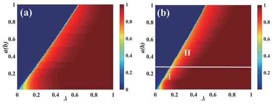 Figure 6 illustrates on the propagation parameter plane (, a)((,b)) for the multi-layer SF network. Then, using the parameters and , respectively, the subgraphs (Figure 6a,b) demonstrate the growth tendency of . When the degree distribution heterogeneity is relatively small, i.e., in subgraph (Figure 6b), the pattern of the individual final spreading scale changes from growing continuously in the phase transition with the second order in region I to growing discontinuously in the first-order phase transition in region II. Consequently, the diagram is split into two sections. Since there are active adoption behaviors in region I, the continuous phase transition with the second order can be seen in the change pattern of . The expanding pattern of indicates the discontinuous phase transition with the first order, which is caused by the individuals’ increasingly negative behaviors in region II. The pattern of the individual ultimate spreading size , on the other hand, grows discontinuously in the first-order phase transition in the entire region when the degree distribution heterogeneity is substantially significant, as in subgraph (a), where . Therefore, the heterogenous degree distribution can affect the growth of and the information propagation.