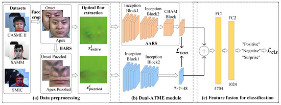 In data preprocessing, to better capture the ME motion information, we computed dual-scale optical flow features between the onset and apex frames. Precisely, one scale feature is from the full face and the other is from the HARS-based puzzled counterpart. In the Dual-ATME module phase, in order to simultaneously learn global and local ME features, we utilize the bi-Inception network for HARS-based and AARS-based (full-face) feature extraction, respectively. Furthermore, in order to be able to better focus on ME-related features in the full-face learning network, we employ a combined channel and spatial attention mechanism module. After obtaining the features at both scales, we narrow the distance between them by means of similarity comparison, which empowers the network to refine the ME features common to both. Finally, emotional category prediction is performed by fusing the HARS-based and AARS-based features.