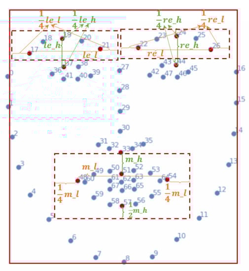 First, based on the landmarks of the mouth and the eyebrows, we performed region detection and cropping to obtain the boundary borders of each ROI (shown as red dotted boxes in Figure 2). Specifically, for the left eyebrow of the i-th ME sample, we calculated the distance between and as le_h and the distance between and as le_l. Then, in order to capture a richer set of information around the left eyebrow, we expanded to the left and right sides of the left eyebrow, while expanding upwards to the top of the left eyebrow. Additionally, to reduce interference from the eye area, we set the lower boundary of the left eyebrow area to . We obtained the boundary of the left eyebrow region through these steps, i.e.,