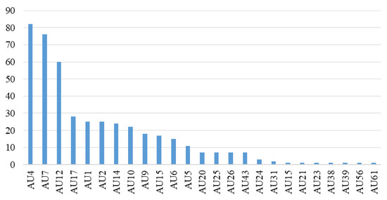 The facial regions with the most muscle activity when MEs occur are the eyebrow and mouth regions [31,51,52]. In other words, these regions contribute most of the discriminative ME information. Furthermore, we conducted a statistical analysis of facial action units (AUs) on ME samples from the CASME II and SAMM datasets of MEGC2019. Based on the AU annotations provided for each ME sample by CASME II and SAMM, we counted and ranked the occurrences of AUs. As shown in Figure 3, it was observed that AUs with higher frequencies were concentrated in the areas around the eyebrows and mouth. Therefore, to reduce the influence of interference from irrelevant regions on MER, our proposed HARS treats the eyebrow and mouth regions as ROIs for local feature extraction. In this way, we can extract more semantic ME-related information.