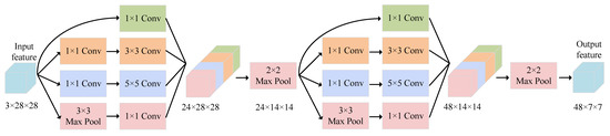 As shown in Figure 4, each branch of our Dual-branch Inception module consists of a bi-Inception module, composed of two Inception blocks [55]. An Inception block combines feature maps of different sizes and receptive fields, enabling the network to capture richer information. Specifically, the single Inception block uses three different sizes of convolution kernels, namely , and , to obtain feature maps of various sizes. Additionally, convolution layers are inserted between the and convolution layers to reduce the number of channels in the feature map, thus reducing the computational cost. In our Dual-branch Inception module, the filters for the first and second layers were set to 6 and 12, respectively. Furthermore, we used max-pooling to aggregate the information from the feature maps after each Inception block in each layer. Therefore, in our constructed bi-Inception module, the dimension of the output from the first and the second Inception blocks were and , respectively.