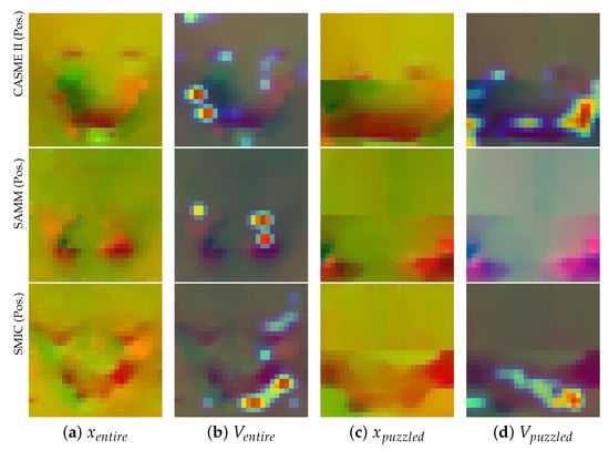 As shown in Figure 7, the Grad-CAM-based [59] feature visualization also proved the above conclusion. Specifically, AU12 represents the upturned corners of the mouth and it was found that the network focused better on the mouth region in the puzzled counterpart. Additionally, the combination of HARS and AARS could achieve collaborative enhancement. As shown in the first row of Figure 7, for this ME sample, AARS only focused on the left corner of the mouth in the full-face image (column (b)). However, the Puzzled image of HARS, based on prior knowledge, was less disturbed, so it not only focused on the left corner of the mouth, but also on the right corner (column (d)). Thus, better MER performance was achieved by fusing the features of HARS and AARS in parallel.