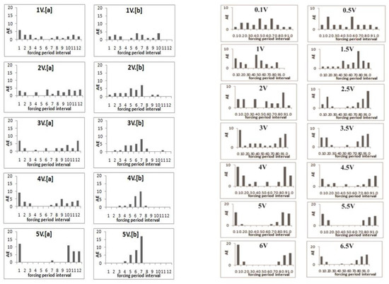 The registered AE data presented in Figure 1 correspond to the slip events triggered by mechanical forcing. It is evident that at low forcing voltages at both normal and tangential forcing the AE onsets are registered in all decimals of the forcing periods in a more or less similar way. At the higher forcing voltages, emissions concentrate at the definite parts of the forcing period, which point to an increasing synchronization of slip events by the weak impact: the slips occur only at the definite forcing phases, i.e., the application of weak mechanical forcing, a thousand times weaker than the main driving force of the spring, promotes the phenomenon of synchronization.