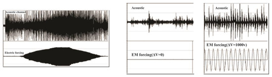 Acoustic emission during slip under variable from zero to 1000 V external periodical voltage (left); the extended part of record at zero EM forcing (middle); the extended middle part of record under maximal EM forcing (right); note complete phase synchronization. There are two sections in the graphs: the upper one shows slip-generated AE events and the lower one, applied AE hits [45].