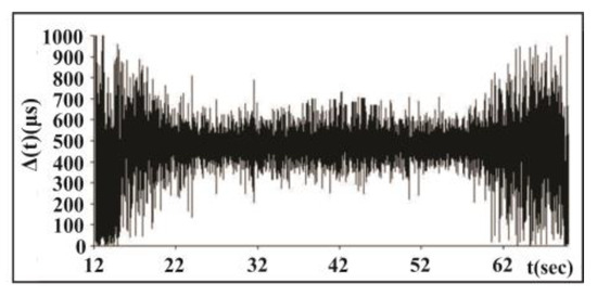 In Figure 3 we present time series of waiting times between the amplitudes of acoustic signals in the consecutive periods of external forcing for a whole record. Significant EM forcing was applied in the time interval from 22 to 60 s of the stick–slip process; in this interval the scatter of waiting times decreases significantly.