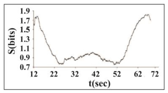 Figure 4 presents the variation of the Shannon entropy value S: the clear decrease in S indicates that the dynamics of acoustic emission becomes much more regular in the synchronized part of the acoustic emission data set, from 22 to 60 s.
