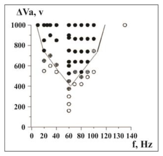 The “phase diagram” for variables f and , or the so-called Arnold’s tongue [29], is presented in Figure 5. It is evident that phase space (Arnold’s tongue) plots at external forcing have a bell-curve form. The minimum of the forcing voltage is observed at 60 Hz.