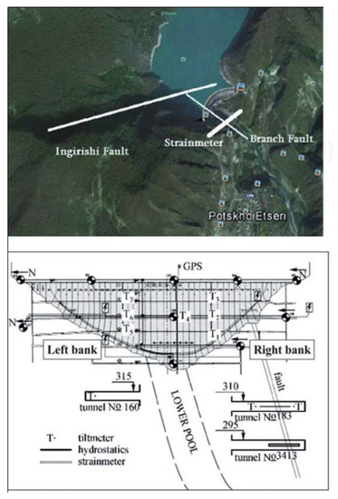 - Chelidze, T.; Matcharashvili, T.; Abashidze, V.; Dovgal, N.; Mepharidze, E.; Chelidze, L. Time Series Analysis of Fault Strain Accumulation around Large Dam: The Case of Enguri Dam, Greater Caucasus. In Building Knowledge for Geohazard Assessment and Management in the Caucasus and Other Orogenic Regions; Bonali, F., Mariotto, F., Tsereteli, N., Eds.; Springer: Berlin/Heidelberg, Germany, 2021; pp. 185–204. [Google Scholar] [CrossRef]