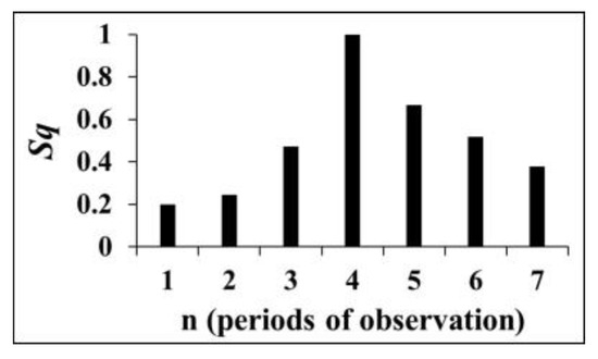 where k is Boltzmann’s constant and Ω is the total number of accessible i microstates of the system with a probability of occupation . The number q, which characterizes the degree of non-extensivity of the system, is an entropic index. The Tsallis entropy, which quantifies the dynamic changes in the complexity of the system, is lower for the cases that are characterized by lower complexity (are less random).