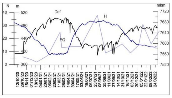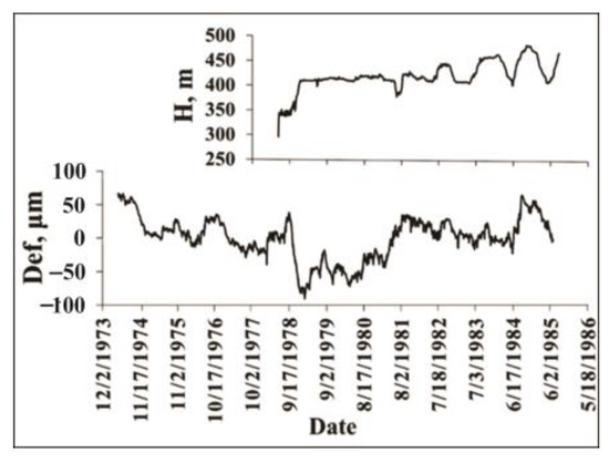 Variation in water level in the lake (H, m) and deformation on the fault (Def, µm) in the period 1974–1985 [55].
