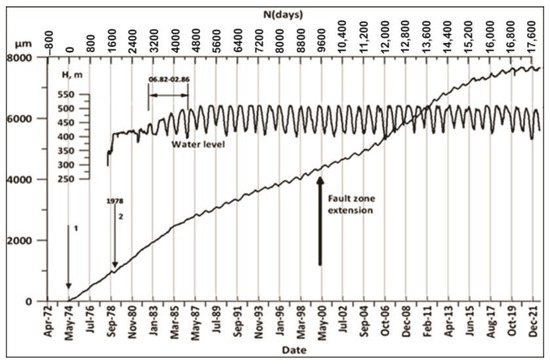 The full-time dynamics of WL in the Enguri Dam reservoir (meters) from 1978 to 2021 (upper curve) and extension/compaction (in micrometers) of the Ingirishi branch fault crossing the foundation of the dam from 1974 to 2021 (lower curve). Arrow 1 marks the start of strainmeter monitoring in 1974 and arrow 2, the beginning of reservoir impoundment [55].