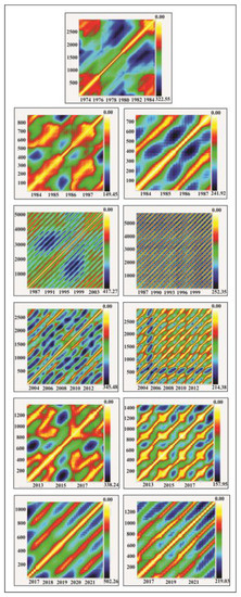 Recurrence plot (RP) of fault displacements’ “time story“ for several successive periods (left column) as well as RP for the water level regime (right column). The first figure is the RP of fault displacement before reservoir filling (1974–1978), i.e., the RP for the natural state; the next figures, P during regular reservoir exploitation. Identical yearly cycles are present in the RPs of fault displacement, beginning from the 1987–2013 period; the last RPs beginning from 2015 differ from the previous regular patterns due to a less-regular WL regime (Figure 12).