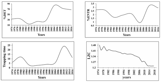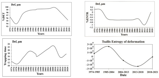 The graphs illustrate the nonlinear dynamics of 45 years’ fault displacement time series for the characteristics RQA determinism (%DET), Boltzmann entropy (%ENTR) and Tsallis entropy (TE) for the order 4 of dam deformation, Trapping times (TT) for period 1974–2021 [55].