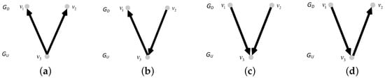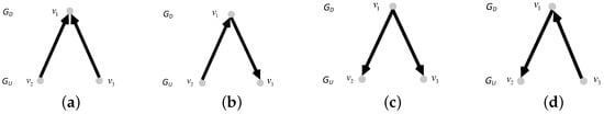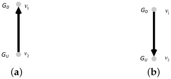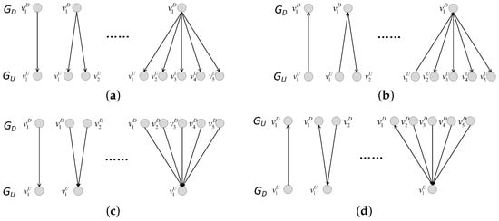In this network model, we consider the coupling patterns of subnets and the proportion of interdependent edges (completely interdependent and partially interdependent). We introduce the coupling patterns in detail. We consider three coupling patterns, i.e., one-to-one coupling, one-to-many coupling, and many-to-one coupling. In the one-to-one coupling pattern, a node in the undirected subnet can be connected to only one node in the directed subnet by an interdependent edge. The interdependent edge has two types, undirected-to-directed interdependent edges and directed-to-undirected interdependent edges, as shown in Figure 1. The undirected-to-directed interdependent edge is a directed edge from the undirected subnet to the directed subnet , as shown in Figure 1a. The undirected-to-directed interdependent edge is a directed edge from the undirected subnet to the directed subnet , as shown in Figure 1b. In the one-to-many coupling pattern, where “many” is set to m, a node in the directed subnet can be connected to nodes in the undirected subnet by interdependent edges. Figure 2 gives all possible combinations in the one-to-two coupling pattern. Figure 3 gives all possible combinations in the two-to-one coupling pattern.