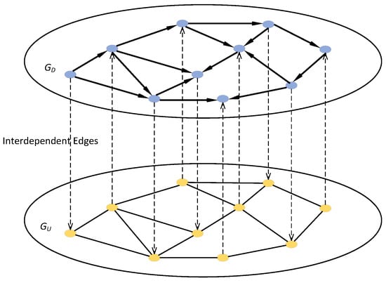 We consider an interdependent network model of two subnets as follows. The subnets of the directed–undirected interdependent network G are assumed to be a simple directed graph and a simple undirected graph . In the directed graph , and denote the node set and directed edge set, respectively. In the undirected graph , and denote the node set and undirected edge set, respectively. These two subnets, and , are coupled via directed edges . The states of edges in , and are defined by