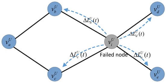 To illustrate the load redistribution process after a node failure in undirected subnet more clearly, we present an example on a simplified network topology (shown in Figure 6). Assuming that node fails at time t, the original load it takes will transfer to its neighboring nodes, , , , and , according to the load-redistribution scheme. At time , the real time load of nodes , , , and will update according to (11).