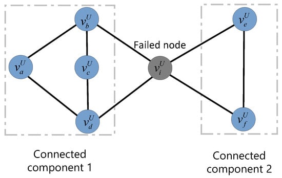Unlike existing research models consisting of two undirected subnets, our model comprises a directed subnet and an undirected subnet. Therefore, in our model, the isolated failed nodes in the undirected subnet are the same as in existing studies; i.e., nodes that do not belong to the largest connected component. To illustrate the largest connected component more clearly, we present an example of a simplified network topology (shown in Figure 7). Assuming that node fails, the topology will be divided into two connected components. Connected component 1 consists of nodes , , , and ; and connected component 2 consists of two nodes, and . It is obvious that connected component 1 is the largest connected component. Therefore, the nodes in the connected component 2 fail due to isolation.