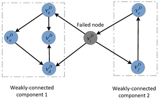 Similarly, for directed subnet , if the node does not belong to the largest connected component, we consider this node to fall into isolation failure. It should be noted that there are two definitions of the largest connected component in the directed graph (i.e., largest weakly connected component and largest strongly connected component). Compared with the largest strongly connected component that requires two-way connectivity between two nodes, the largest weakly connected component is much looser and more suitable for observing the failure propagation process in directed networks. Therefore, the concept of the largest weakly connected component is commonly used to determine the size of the surviving nodes in directed networks [15,17]. In this work, we also use the largest weakly connected component to determine the connectivity of nodes in directed networks.