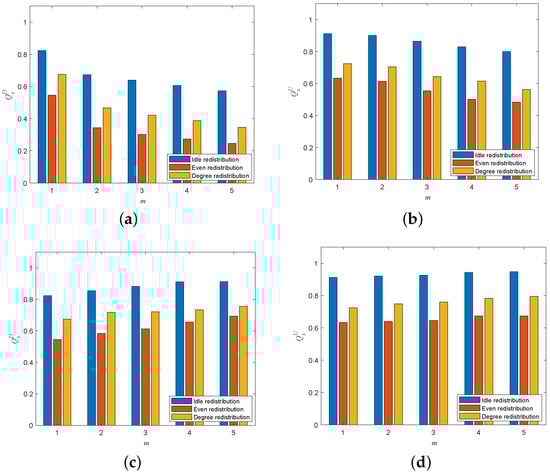 Figure 14 shows the cascading robustness of directed–undirected interdependent networks with different load-redistribution schemes under the single-node attack. We can easily observe that the cascading robustness of the network under the idle redistribution strategy is significantly better than the other two redistribution strategies. This is due to the fact that under the idle redistribution strategy, nodes with more capacity can receive more load from the failed nodes, thereby minimizing the overload risk of nodes with insufficient capacities. In contrast, under the degree-redistribution strategy and the even-allocation strategy, nodes with insufficient capacity are not subject to addition protection, and may even receive more load from failed nodes, which will significantly increase the overload probability of these vulnerable nodes and lead to an increased risk of cascading failures in the network.