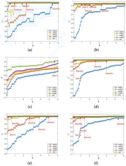 As shown in Figure 15, as the overload-tolerance coefficient increases, the cascading robustness of directed–undirected interdependent networks can be greatly improved. This is because in our model, a higher means that nodes can have more capacity to cope with the load. In addition, we can also observe that in both single-node attack scenarios, an increase in the load-exponential coefficient can significantly improve the cascading robustness of interdependent networks with different coupling patterns. Regarding the single-node attacks on the undirected subnet of the one-to-one interdependent network, in the cases of and , , which means that there is a high possibility of cascading failures. When stays the same and rises to 2, the is 0.7, which means that the risk and damage of cascading failures are greatly reduced. In addition, we can also observe that there is a threshold value . When is less than , the increase in is helpful to the cascading robustness of the interdependent network. When is greater than or equal to , the lifting effect of the parameter is saturated.