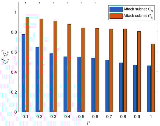 where and , respectively, represent the cascading robustness levels of the directed–undirected interdependent network after multi-node attacks on the directed subnet and undirected subnets; represents the number of normal nodes in the undirected subnet (denoted by U) after removing proportion P of nodes in directed subnet (denoted by D). In the experiments, multi-node attack strategies were mainly used to analyze the main causes of network performance degradation during cascading failures.