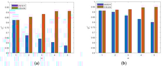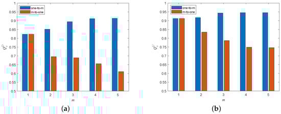 Figure 18 shows the effects of different coupling patterns on the cascading robustness of the interdependent network when increasing the directed-to-undirected interdependent edges. We can easily observe that in the one-to-many interdependent network, the cascading robustness decreases significantly as m increases, and in the many-to-one interdependent network, the cascading robustness can be significantly improved as m increases. This is due to the fact that in the one-to-many interdependent network, each node with interdependent edges in the directed subnet needs to establish connections with m nodes in the undirected subnet. In this case, the dependency of the undirected subnet on the directed subnet will gradually increase as the number of directed-to-undirected interdependent edges m increases, which makes the node failure in the directed subnet more easily propagated to the undirected subnet. In contrast, in the many-to-one interdependent network, each node with interdependent edges in the undirected subnet needs to establish connections with m nodes in the directed subnet. As the number of directed–undirected dependent edges m increases, the dependence of the undirected network on the directed subnet will gradually decrease, which makes it more difficult to propagate node failures of the undirected subnet to the directed subnet. At the same time, the conditions for node failure in the directed subnet will become more demanding.