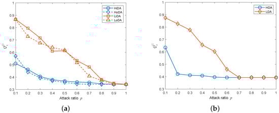Figure 20 shows the cascading robustness when removing fraction p of nodes in the attacked subnet. The ratio p represents the proportion of nodes removed from the network in each multi-node attack according to the specific attack strategy. The higher the value of p, the greater the number of nodes removed from the network. We can easily find that cascading robustness gradually decreases as the attack ratio p increases. In addition, there are significant differences in the degrees of damage caused to the network by different attack strategies. In the case of attacks on the directed subnet, the most harmful to the network are the HiDA and HoDA strategies, followed by the LiDA and LoDA strategies. Among the attacks on the undirected subnet, the most damaging to the network is the HAD strategy, followed by the LDA strategy. Take the the multi-node attack scenario with undirected subnet as an example: Removing of the nodes in the undirected subnet in the HDA strategy can crash the whole network. In contrast, even if of the nodes in the undirected subnet are removed by the LDA strategy, more than of the nodes in the entire network system can still work properly. This result tells us that to improve the cascading robustness of the directed–undirected interdependent network against malicious attacks, we should give priority to protecting the high-in-degree and high-out-degree nodes in the directed subnet and the high degree nodes in the undirected subnet.