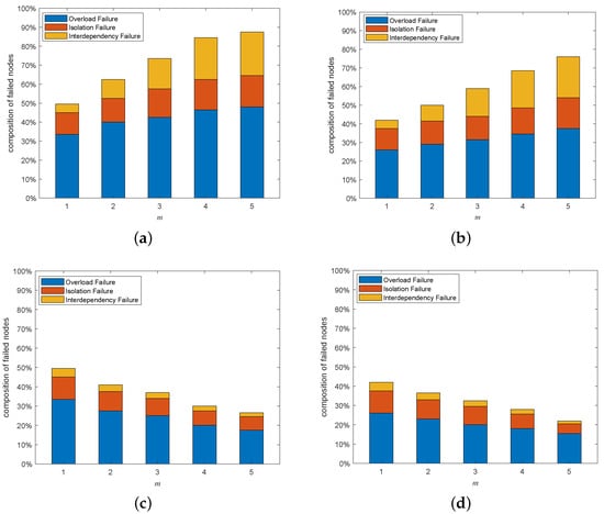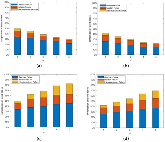 Figure 21 depicts the composition of the failed nodes for the interdependent networks with different coupling patterns generated by adding directed-to-undirected interdependent edges. It can be easily observed that the highest proportion of failed nodes in the whole interdependent network system was overload-failure nodes, followed by isolation-failure nodes and interdependency-failure nodes. Therefore, we can improve the cascading robustness of the network by increasing and to help the network nodes better withstand the influence of network-load redistribution. In addition, in the one-to-many interdependent network, the proportions of interdependency-failure nodes, overload-failure nodes, and isolation-failure nodes all increase as m increases; and in the many-to-one interdependent network, the proportions of interdependent failure nodes, overload-failure nodes, and isolation-failure nodes all decrease as m increases. The proportion of each type of faulty node varies with the same trend as m, due to the fact that the appearance of interdependency-failure nodes originates from the mutual propagation of node failures between subnets. Interdependency-failure nodes further affect the numbers of overload-failure nodes and isolation-failure nodes within the subnet due to load redistribution. Next, we explain the reason for the variation in the number of interdependency-failure nodes with m different coupling patterns by analyzing the coupling patterns that appear when adding directed-to-undirected interdependent edges.
