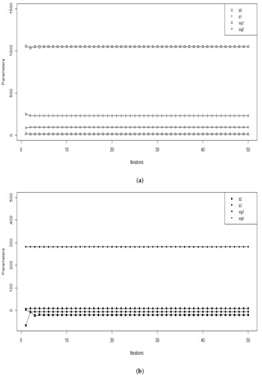 In [16], the author presented the fixed interactions between two factors in an LMEM, using the maximum product interaction F-test. Ref. [17] was interested in the sample size of an LMEM. He proposed a formula to estimate the sample size based on testing a mixed model that contained fixed interactions. In 2019, ref. [18] proposed an estimation method to recover the principal effects and interactions, because the existing method did not allow the integration of these effects in a mixed data frame. They approved that the proposed method gave optimal results to their applications’ conditions. On the same side, ref. [19] presented the estimation of the fixed interactions. These interactions are normally introduced by the product of the variables, but the algebraic transformations revealed that this technique did not produce a within-unit estimator. A Monte Carlo method confirmed that the FE (fixed-effects) estimator of was biased, if one of these variables was correlated with another one. In order to present the interaction between x and z, it is possible to use the current syntax . This consideration is called “double-demeaned”; it is less efficient than the standard FE and only works with . For the application in R, the Markov chain Monte Carlo method is applied using the package mcmc. Ref. [20] introduced the MCMCpack package that contains functions to perform Bayesian inference using a posterior simulation for a number of statistical models (https://CRAN.R-project.org/package=MCMCpack (accessed on 14 Jun 2011)), while [21] presented the package MCMCglmm (https://cran.r-project.org/web/packages/MCMCglmm/index.html (accessed on 2 February 2010)) for the MCMC method to fit the generalized linear mixed-models for multiple response vectors. This method was also used by [22] to identify unknown parameters in the biological field, such as detecting the concentration of target molecules, because of the importance of this method for extracting the information. The MCMC method was applied in the work of [23] to solve mechanical problems by using a Bayesian method.