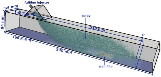 In this study, the model validation is carried out for multi-phase fluid flow phenomena including the AdBlue and water injection in a generic SCR configuration (see Figure 1, [,]) for only the selected operating conditions. Subsequently, the numerical analysis is carried out for more realistic SCR operating conditions as reported in []) that also includes AdBlue injection and resulting urea decomposition with NH3 conversion. Finally, the estimation of the entropy production of the individual processes is carried out using the respective formulation as provided in Equations (24)–(29).