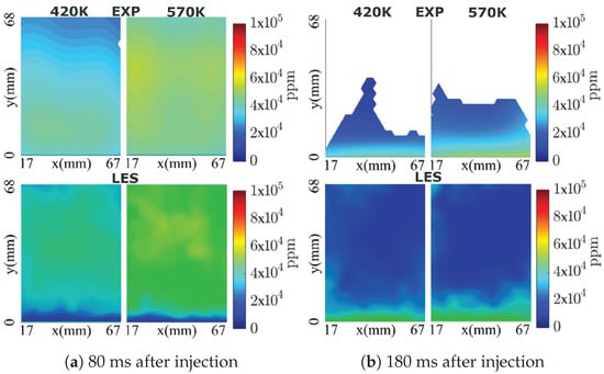 In order to validate the adopted numerical methodology, first the measurement data for the evolution of AdBlue film thickness on the bottom duct wall over many injection events as reported in [] is used. The processes of spray–wall interaction and film dynamics under high temperature conditions essentially require a conjugate heat transfer approach to take properly in to account the thermal inertia of duct material. This is not considered in this study due to associated high computational cost. In fact simulations are carried out with pre-initialized film thickness and wall temperature suggested by experimental measurement, and thus representing a scenario of wet-wall splashing. Subsequently simulations are carried out for total 60 and 54 injection events for cases C1 and C2, respectively. Figure 2 depicts the AdBlue film thickness plotted for many injection cycles for the two operating conditions C1 and C2. The respective film thickness profiles obtained with LES are shown in solid circles. The compared results show a reasonable agreement for the wall film thickness, especially for the scenario of developed AdBlue wall film. A detailed numerical validation has already been carried out for transient evolution of film thickness for both early stage and late injection events for one operating condition ( = 180 °C and = 6.5 m/s) in [,]. It should be noted that, the film evolution features highly transient and complex phenomena that essentially depend on the surface properties, operating conditions and thermo-chemical state of the film mass (see also Figure 2). In addition, localized point measurements are carried out for film build-up during multi-cycle AdBlue injection (1 Hz injection frequency). This leads to the difficulties associated with the reproducibility by experimental measurements as reported in []. Second, the available measurement data (cases “CW1” and “CW2”, in which only water is injected) for H2O species mass fraction and temperature profile are employed for a further evaluation of the numerical methodology []. The phased averaged data were obtained for 10 consecutive injection events with injection frequency of 1 Hz. Water was injected with a constant injection rate of 11.7 kg/h for 40 ms of injection duration and hence the mean injection rate of ≈500 g/h. In line with the experiment, the numerical simulations are also carried out for 10 consecutive injection cycles and the LES results are obtained by phase averaging the H2O species mass fraction and temperature profile in the cases “CW1” and “CW2” for two instances (80 ms and 180 ms after injection) on the plane at 510 mm downstream the injector nozzle (see plane “P” in Figure 1). The comparison of the LES results with the experimental data for the H2O species mass fraction is shown in Figure 3. A strong impact of the gas phase temperature can be clearly seen in overall species distribution along the duct section with obviously higher mass fraction of H2O for higher carrier gas temperature due to the enhanced evaporation. Additionally, the distribution of H2O mass fraction looks more uniform at time 80 ms after injection. This can be attributed to the convection of evaporated H2O which is further mixed during the spray evolution. Subsequently, at instance 180 ms after injection, the higher mass fraction is observed primarily along the SCR duct wall indicating the evaporated H2O mass has already convected beyond the plane of interest (z = 510 mm) and the visible H2O vapour is supplied by evaporation of liquid film and/or by the evaporation of spray droplets slowed down along the wall due to the spray–wall interaction and the boundary layer flow. These trends are clearly visible in both experiment and LES obtained results suggesting a reasonable agreement especially by also considering the observed range of H2O mass fraction in LES and experiment. However, there is a visible deviation near the bottom duct wall for instance of 80 ms after injection as almost no H2O vapour is present in this region. It can be partly attributed to the complex nature of the wall film dynamics as highlighted earlier and partly to the delayed transport of water vapour, similar to the later instance of 180 ms after injection. Similar observation can be also made for the corresponding temperature profiles as shown in Figure 4. A lower phase temperature is observed for instance of 80 ms after injection suggesting the utilization of gas phase sensible heat to evaporate the water droplets. Subsequently, the gas phase temperature is low along the SCR duct wall that corresponds to film and/or droplet evaporation along the wall. However, apart from the temperature over-prediction in LES, there is obvious difficulty for direct and quantitative comparison of both LES and the experimentally obtained temperature profile especially at later stage due to the unavailability of complete measurement data. It should be also observed here that the comparison is performed only for 10 injection events which remains too small to carry out a reliable comparison when considering the highly transient and complex nature of the flow dynamics.