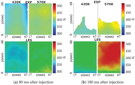 Comparison of temperature profile at plane “510 mm” downstream to the injector for two operating conditions ( m/s, K and m/s, K) [].