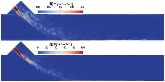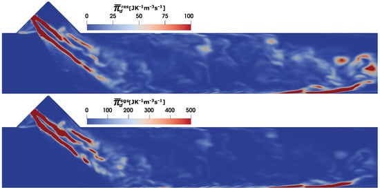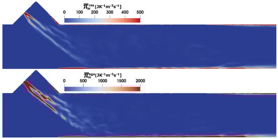 Next, the entropy generation rates due to heat dissipation (see Equation (25)) are shown in Figure 7. Similar to the viscous dissipation, the sgs contribution to the entropy generation dominates the total heat entropy generation source term. The higher temperature gradients along the spray surface and the duct wall (see also the temperature profile in Figure 5) are mainly responsible for the higher entropy production due to heat dissipation. It should be noted that the presence of the wall film and its evaporation induces a large temperature gradient near the SCR duct wall.