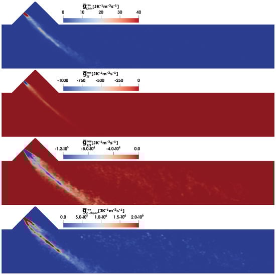 where the first terms on the left-hand side represent the local entropy change, entropy convection and the flux of entropy density , respectively. The last five terms on the right-hand side express the filtered entropy production rate by viscous dissipation , heat dissipation , mass diffusion , chemical reaction and contribution due to the presence of dispersed phase . According to [,,], and within the LES context, the temporal averaged filtered entropy production rates can be calculated as the sum of the resolved and residual part for , , and as: