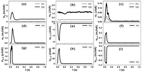 The total entropy generation for individual processes in a the SCR domain during one injection event for Case-2: (a) viscous dissipation, (b) heat dissipation, (c) mixing, (d) chemical reaction, (e) droplet evaporation, (f) due evaporated mass kinetic energy (resolved), (g) due evaporated mass kinetic energy (sub-grid), (h) evaporated mass chemical potential and (i) due to momentum exchange between droplet and carrier phase; res (resolved), sgs (sub-grid scale).