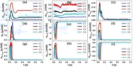 Comparison of the total entropy generation for individual processes in a the SCR domain during one injection event for all 4 operating conditions: (a) viscous dissipation (sgs only), (b) heat dissipation (sgs only), (c) mixing (sgs only), (d) chemical reaction, (e) droplet evaporation, (f) evaporated mass kinetic energy (resolved), (g) evaporated mass kinetic energy (sub-grid), (h) evaporated mass chemical potential and (i) momentum exchange between droplet and carrier phase.