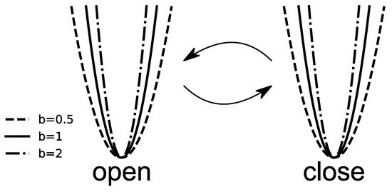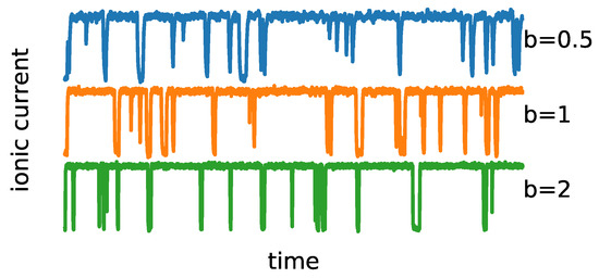 In contradiction to the temperature dependence, slope entropy remains constant for any of the examined values of b. It suggests that increments of ionic currents over time are statistically identical for potential conformational change. Still, one can notice this measure’s lower, although still constant, value for . Based on the increments, rather than the values themselves, the information loss estimate remains insensitive to localization changes.