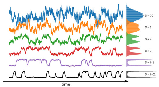 Figure 5, we present the trajectories (ionic currents) for the selected values of the noise intensity, together with the corresponding distributions (histograms). Please note the vanishing separation of states in the distributions for higher noise intensities (