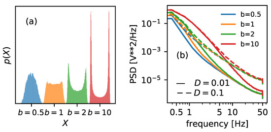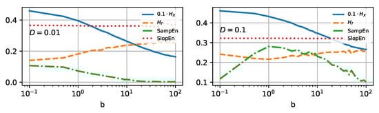 b, regardless of the noise intensity. This, in turn, should increase entropy measure based on these characteristics—cf. the orange dashed line in