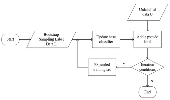 The basic idea of the Tri-training algorithm is as follows: first, three base classifiers are generated by randomly sampling training samples from single-view labeled data through the method; second, the training set of the three base classifiers is expanded, and any two base classifiers have the same prediction result for the unlabeled data sample , then is added to the training set of the third base classifier; finally, the base classifier is updated under the condition that the iterative process is satisfied until the base classifier error rate no longer changes and the training process is completed. The specific process is shown in Figure 1.