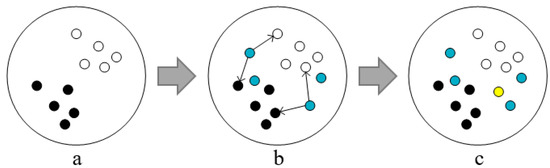The pre-selected samples of the expanded training set are obtained by sampling from the unlabeled dataset . For sample regions that are in a dense degree, it is easier to use the nearest neighbor idea to determine whether the samples are suspicious noise, while the sparse sample regions do not work well using the nearest neighbor idea. As shown in Figure 2, let Figure 2a,b be the training data of rounds and , respectively, and the blue samples are pre-selected samples. When the pre-selected samples are in a dense area, it is more accurate to use the nearest neighbor approach to discriminate the noisy samples because the closer they are, the higher the probability of belonging to the same class of clusters. On the one hand, it is difficult to accurately predict the labels of the sparse samples in the initial iteration process because of the weak learning ability of the base classifier. This is due to insufficient training data; on the other hand, the distance between the sparse samples is large, the probability of belonging to the same cluster is low, and the nearest neighbor is easy to misidentify the pseudo labels. At the same time, as the number of iterations increases, the samples in the sparse region in the round will change due to the continuous expansion of the training set. The denseness of the region they belong to will change afterwards, as shown in Figure 2c, the region where the yellow samples are located becomes more dense after the round iteration, and the inaccurate prediction of the unlabeled samples in the early iteration process will have an important impact on the labeling of suspicious noise samples afterwards.