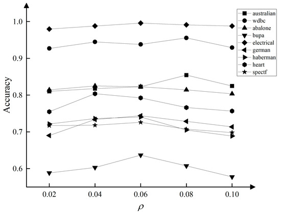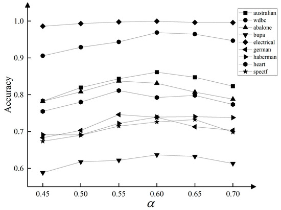Experiment 1 control , the accuracy of the TTADEC algorithm was obtained on 9 datasets when . The experimental results are shown in Figure 3. It can be seen from the Figure that, in most cases, the value is more accurate in the interval . Experiment 2 control to obtain the accuracy of the TTADEC algorithm when on 9 datasets, and the experimental results are shown in Figure 4. It can be seen from the figure that, in most cases, takes the highest accuracy when the value is in . In overview, considering the time cost of the algorithm is set to the median of the interval as 0.6 and is taken as 0.06 for subsequent experiments.