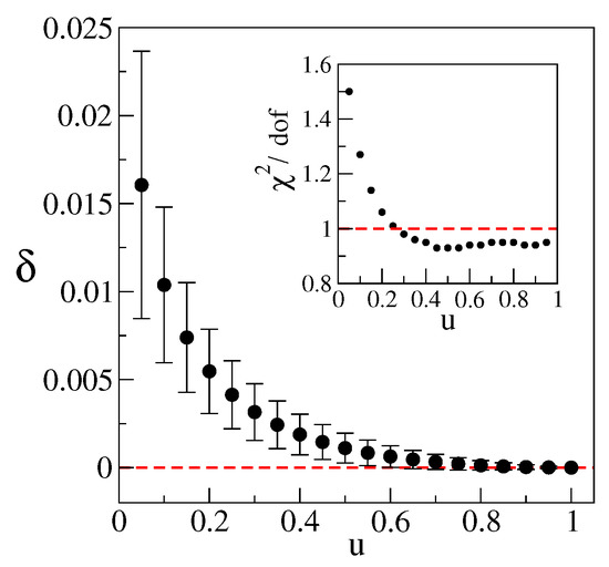 To extract from the data in an unbiased way, we included it as a parameter in general two-power fits of the above ratio in the form . The role of the second power is to absorb finite-volume effects, and its presence resulted in very stable results. Unconstrained two-power fits were mainly afforded by our extensive statistics (30K–100K of disorder realizations). We proceeded by finding the smallest size in , such that the fit in the range yielded for data. The resulting was then fixed for fits at all u, leading to shown in Figure 1. The respective are shown in the inset.