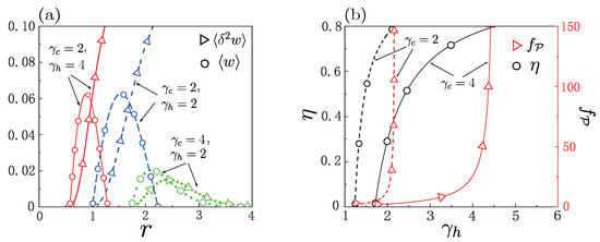 For complete thermalization along each isochore, Figure 3a displays the average work (19) and the work fluctuations (20) as a function of the compression ratio r, respectively, for , and . While the efficiency is improved by increasing r for given and , the average work first increases, and then decreases as the ratio r increases. The behavior of curves for work fluctuations as a function of r is dependent on and . It can be observed from Figure 3a that, while for the curve of work fluctuations, as a function of r, is linear, it becomes parabolic when . Both the work fluctuations and average work for are much smaller than those obtained from the case when . Figure 3a also shows that the regime of positive work is sensitively dependent on the values of the parameters and , and the presence of adiabatic deformation changes the positive work condition for the quantum engine.