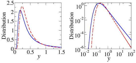 Scaled fidelity susceptibility distributions in the linear (left) and logarithmic (right) scales for GOE, Equation (33) (blue lines) and GUE, Equation (34). Observe a power law tail at large scaled fidelities, y.